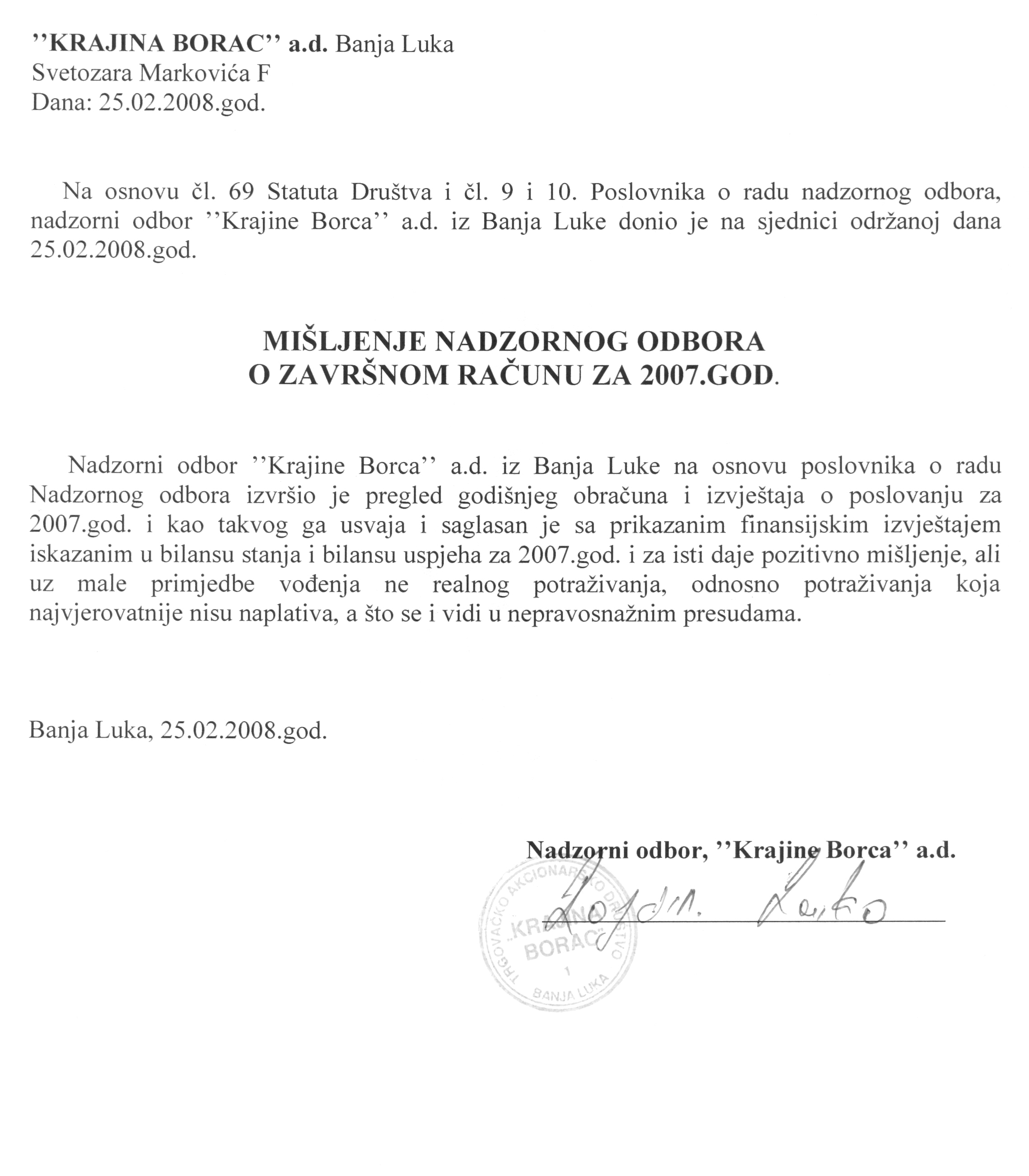 Krajina Borac a.d. Banja Luka - Mišljenje Nadzornog odbora za FI 2007.