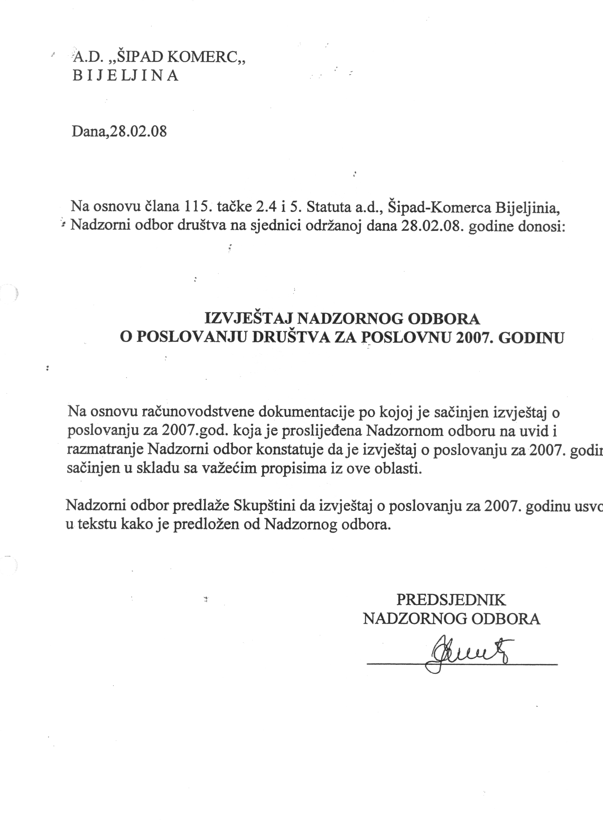 Šipad - komerc a.d. Bijeljina - Mišljenje NO o finansijskim izvještajima za 2007. godinu